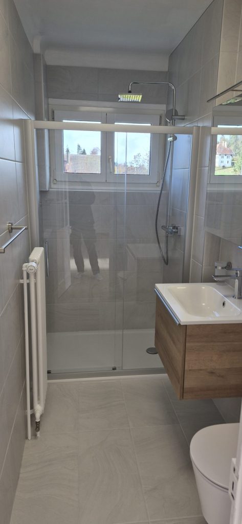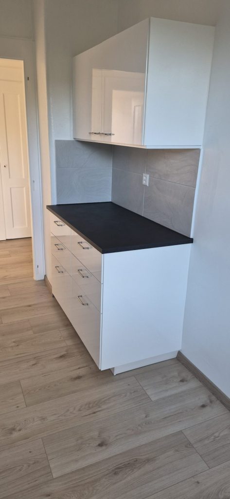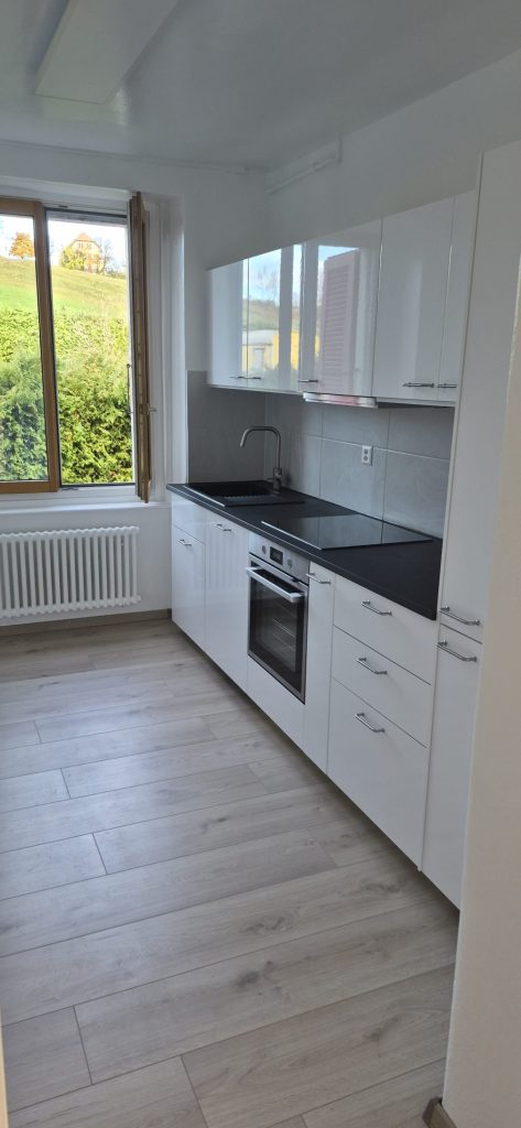 Appartement entièrement rénové à neuf de 3 pièces à louer au 1er étage d’un immeuble proche des transports publics, quartier calme, très bien situé sur les hauteurs des Monts, cuisine agencée, 1 salle de douche/WC, 1 galetas, 1 cave, jardin en commun.