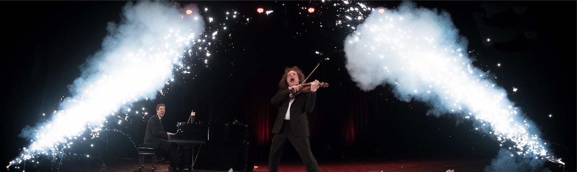 Le violoniste polymorphe vocal et son acolyte pianiste d’une verve irrésistible vous emmènent dans leurs différents univers musicaux, sur un rythme effréné, avec ingéniosité et folie. Dès les premières notes, les grands œuvres deviennent sujettes à un monde imaginaire et le rapport burlesque s’installe entre les deux personnages. Un cartoon où l’absurde n’a d’égal que la virtuosité. Une pincée d’AC/DC, un soupçon de Stevie Wonder et un zeste de Rolling Stones, le tout mélangé dans un wok musical relevé d’une sauce Bach et Tchaïkovsky et on obtient le wok’n woll…