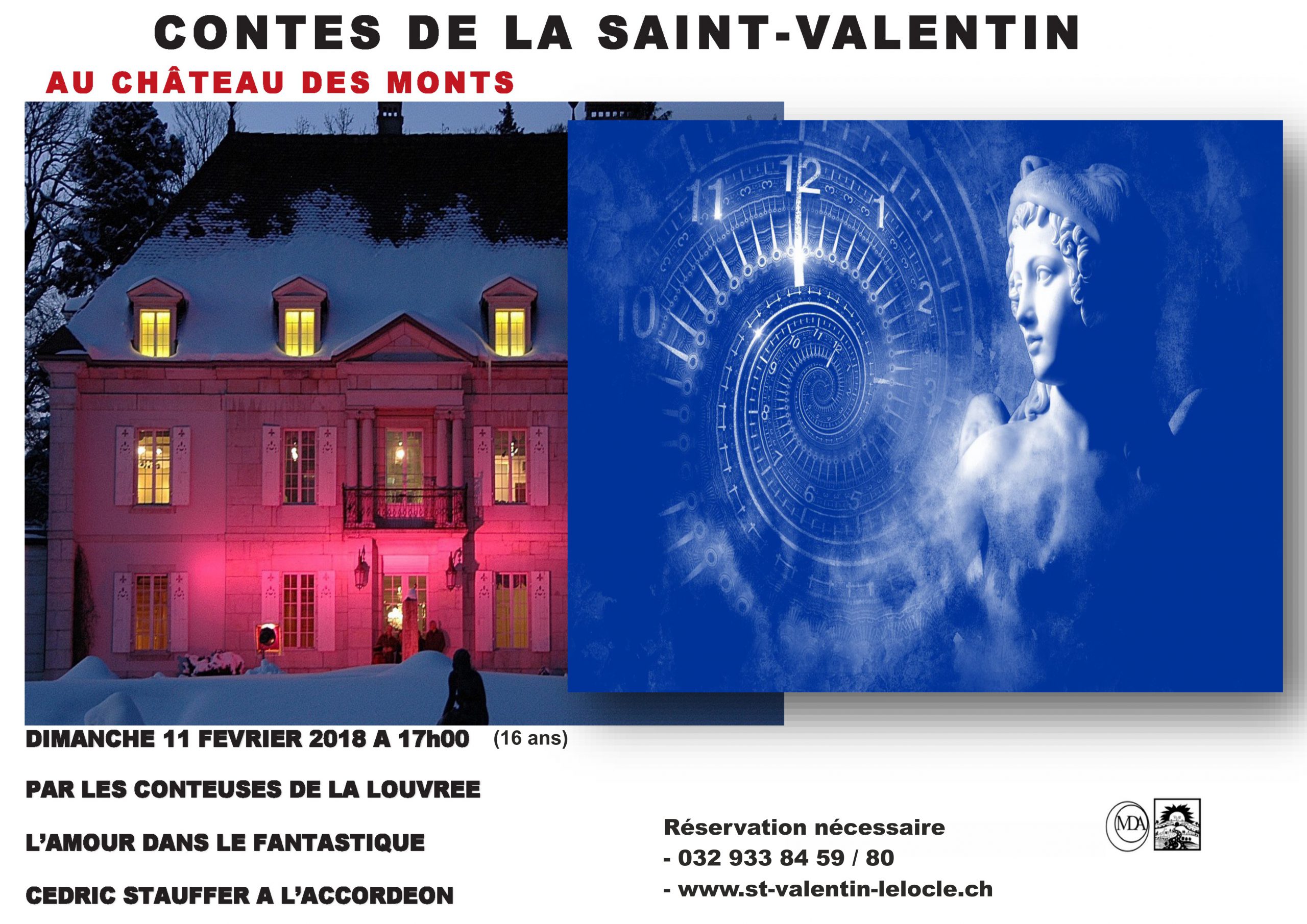 - Dimanche 11 février 17h: Veillée « Contes de la Saint-Valentin » au Château des Monts par les conteuses de la Louvrée: « L’amour dans le fantastique » avec la participation de Cédric Stauffer à l’accordéon. Inscriptions fortement recommandées. 032 933 84 59 / 80